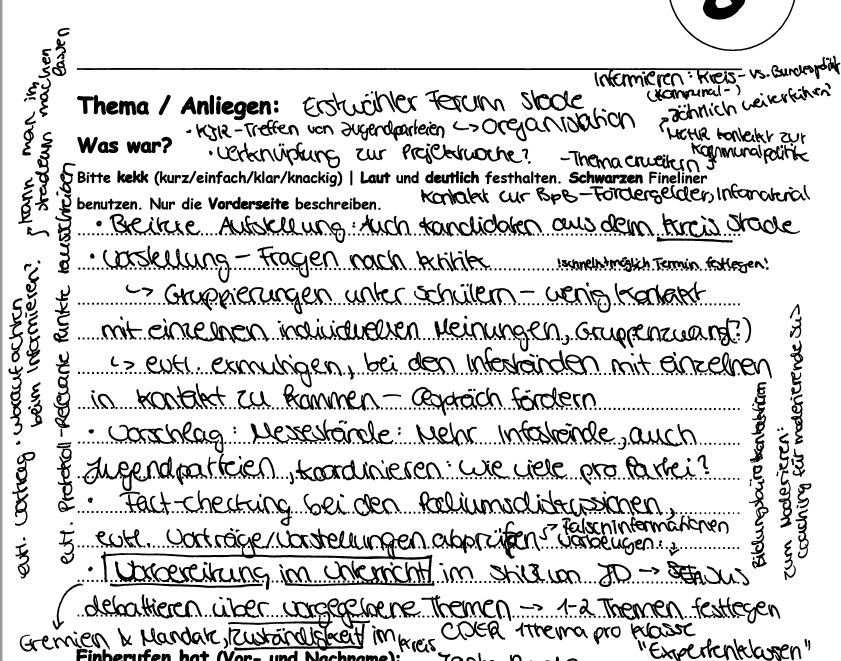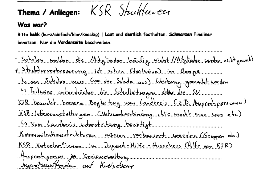 Aus den Reihen des KSR kam die Rückmeldung, dass der KSR sich zum Teil nicht gesehen und allein gelassen fühlt und weit hinter seinen Möglichkeiten zurückbleibt. Auch hier bildete die Gruppe Ideen, Problemlagen und Forderungen: