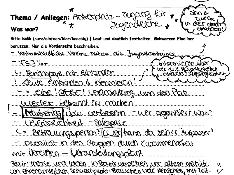 Durch die große Fläche und ländliche Strukturen sowie den schwachen ÖPNV sind die wenigen Orte für Jugendliche schlecht zu erreichen und zum Teil durch schlechte Informationsverteilung nicht hinreichend bekannt. Hier die Ideen der Gruppe: