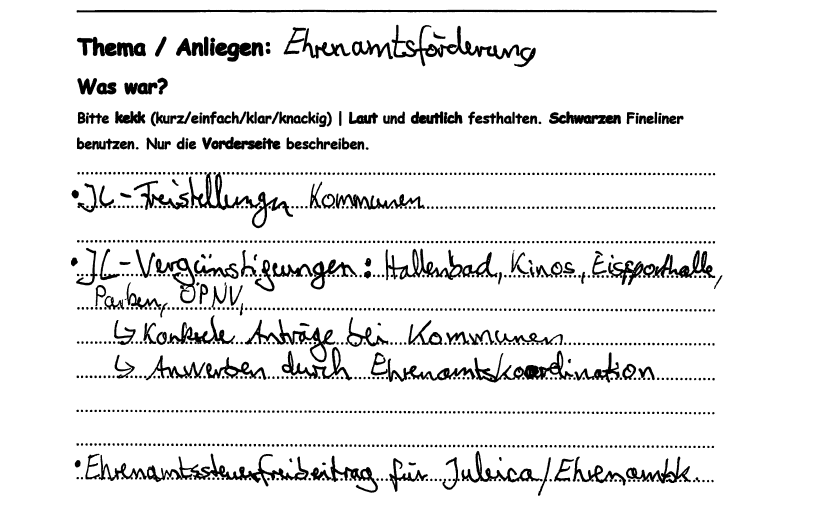 Die Jugendarbeit lebt von seinen freiwilligen und ehrenamtlichen Unterstützern. Deshalb liegt es allen Vereinen und Verbänden sehr am Herzen dies so attraktiv und einfach wie möglich zu halten. Erfolge in den letzten Jahren waren hier unter anderem der Juleica-Booster und einige Rabatte die man mit der Juleica bereits bekommt. Auf diesem System aufbauend hat die Workshoprunde folgende Ideen zusammengetragen: