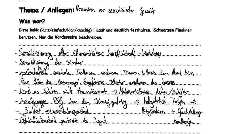 Sexualisierte Gewalt ist (leider) ein allgegenwertiges und durchaus wichtiges Thema. Besonders die Jugendarbeit sollte sich hier informieren, weiterbilden und geschult sein. Viele Vereine und Verbände haben seit Einführung des Kinderschutzgesetzes 2012 bereits ein Schutzkonzept entwickelt und eingeführt und leben dieses aktiv. Um das Thema zu vertiefen und zu verbessern haben hier die Teilnehmenden der Workshopgruppe folgende Ansätze und Ideen ausgearbeitet: