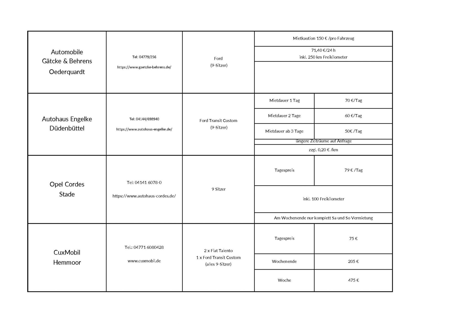 Etwas teurer, aber dennoch attraktiver als eine Autovermietung zu nutzen, sind die Kleinbusse von lokalen Autohäusern. Wir sind dankbar, dass sich diese Unternehmen mit der Bereitstellung von Bussen für Vereine und Gruppen - auch der Jugendarbeit - engagieren: