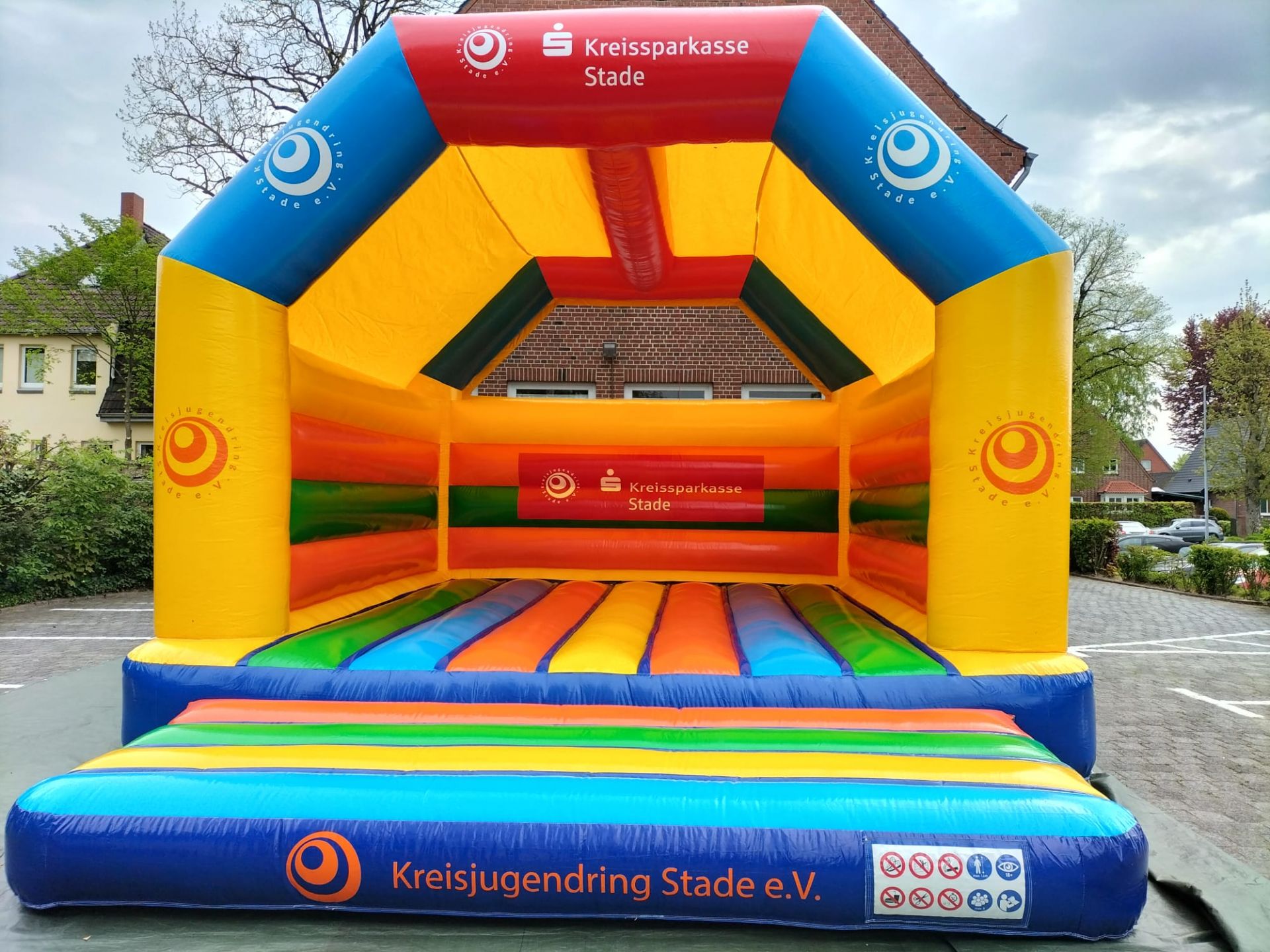 Unsere Hüpfburg verleihen wir nur an Personen, die bei uns eine Einweisung mitgemacht und dadurch unseren Hüpfburg-Schein erworben haben. Wir bieten diese EInweisung gerne immer wieder an. Sprecht uns bitte an. Die Maße der Hüprbug sind: 6,50 m x 5,20 m x 4,50 m (L/B/H). Bitte beachtet, dass rundrum ein weiterer Meter Platz gebraucht wird, um die Hüpfburg sicher zu platzieren. Eine Grundfläche von mindestens 8 x 8 m ist daher einzuplanen.